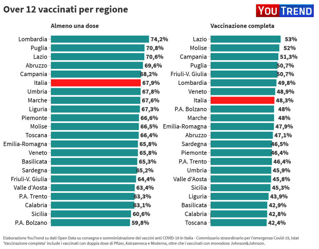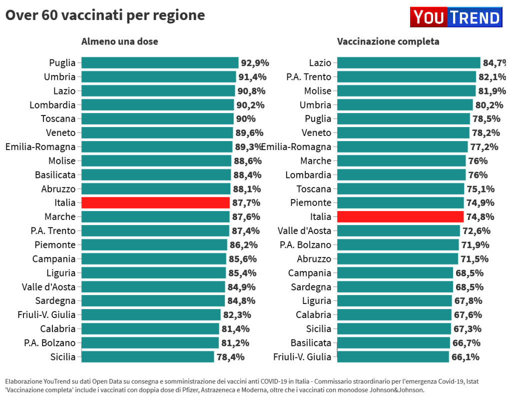 A ieri, in Italia, le persone sopra i 12 anni (quelle “vaccinabili”) che hanno completato il ciclo vaccinale sono il 48,3% del totale [dati YouTrend]: poco meno di una su due, insomma. La percentuale sale al 67,9% (più di due persone su tre) considerando chi ha ricevuto almeno una dose. Sempre grazie ai dati elaborati da YouTrend, possiamo guardare alla lente di ingrandimento la situazione degli over60, il target che è stato vaccinato per primo perché più a rischio: in questa fascia di popolazione, quasi il 75% delle persone appartenenti a questa fascia di popolazione (tre persone su quattro) ha completato il percorso vaccinale, mentre quasi l’88% ha ricevuto almeno una dose. La differenza è data, ovviamente, dalle persone ancora in attesa di ricevere la seconda dose, visto che l’intervallo tra le due somministrazioni di Vaxzevria (il vaccino di Astrazeneca) è più o meno di 3 mesi, quindi molto più lungo rispetto a quello dei vaccini a RNA messaggero.